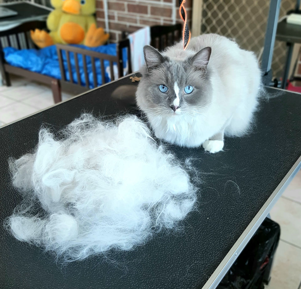 Stunning Ragdoll cross Chinchilla cat getting a pampered deshedding and grooming with Lush Pet Care.